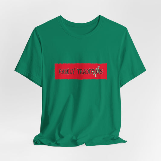Family Traditions Mistletoe T‑Shirt — Christmas Red Banner Graphic Tee by artist Marie Frederique