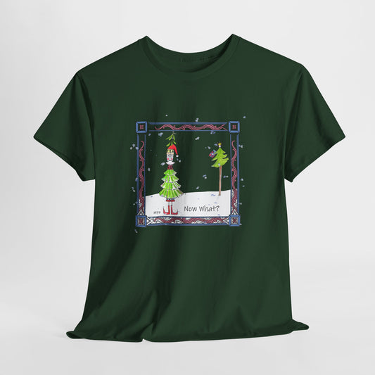Mistletoe Christmas Tree Elf T-Shirt – Funny "Now What?" Holiday Tee by artist Marie Frederique