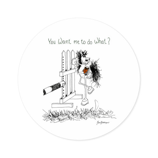 CTS - You want me to do what? from a horse's point of view - Equestrian Round sticker, indoor/outdoor by Artist Marie Frederique