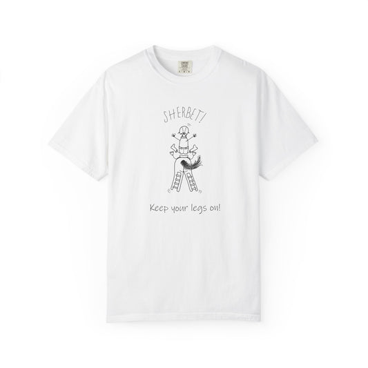 Equestrian KEEP YOUR LEGS ON! T-shirt - Jumping Caricature Design by artist Marie Frederique