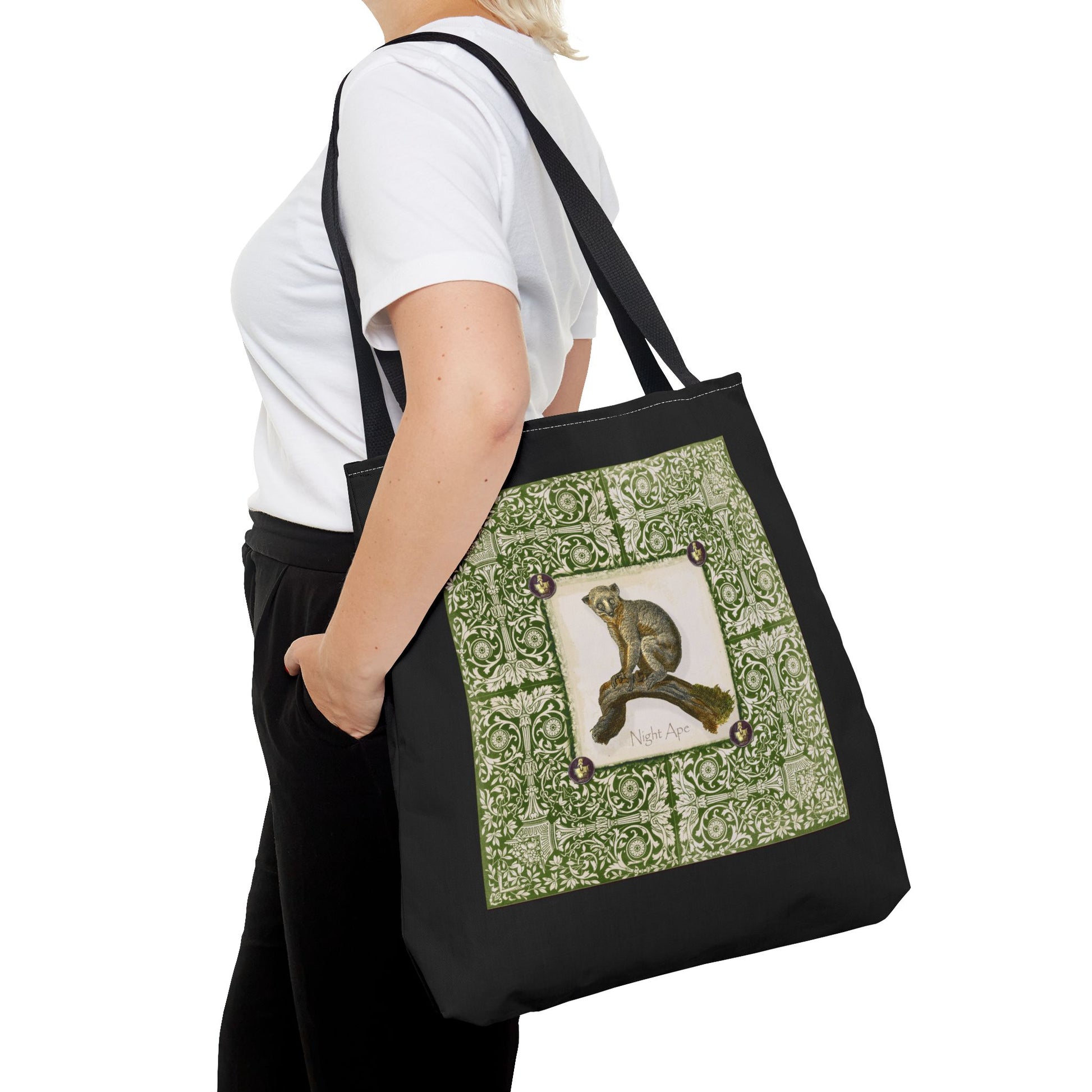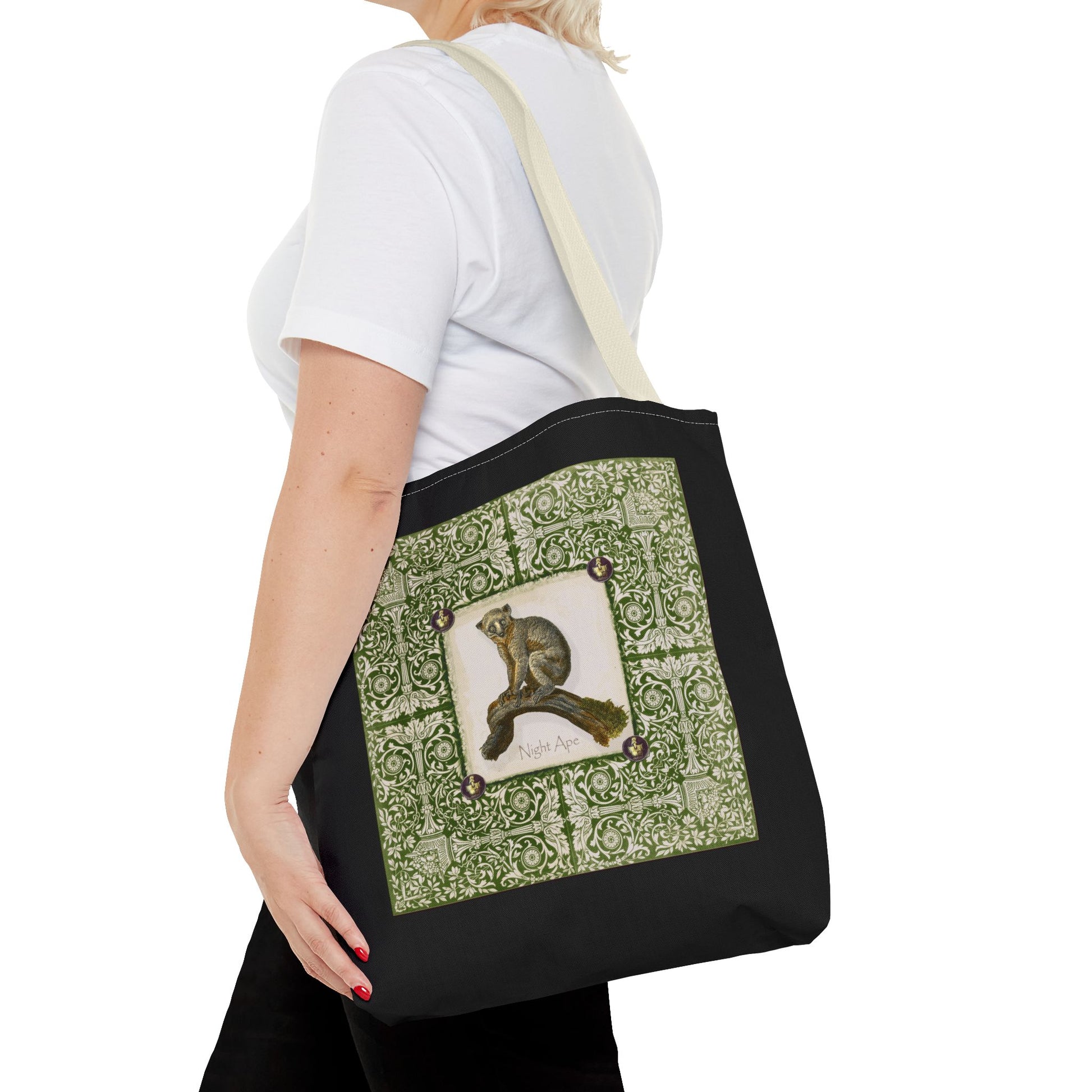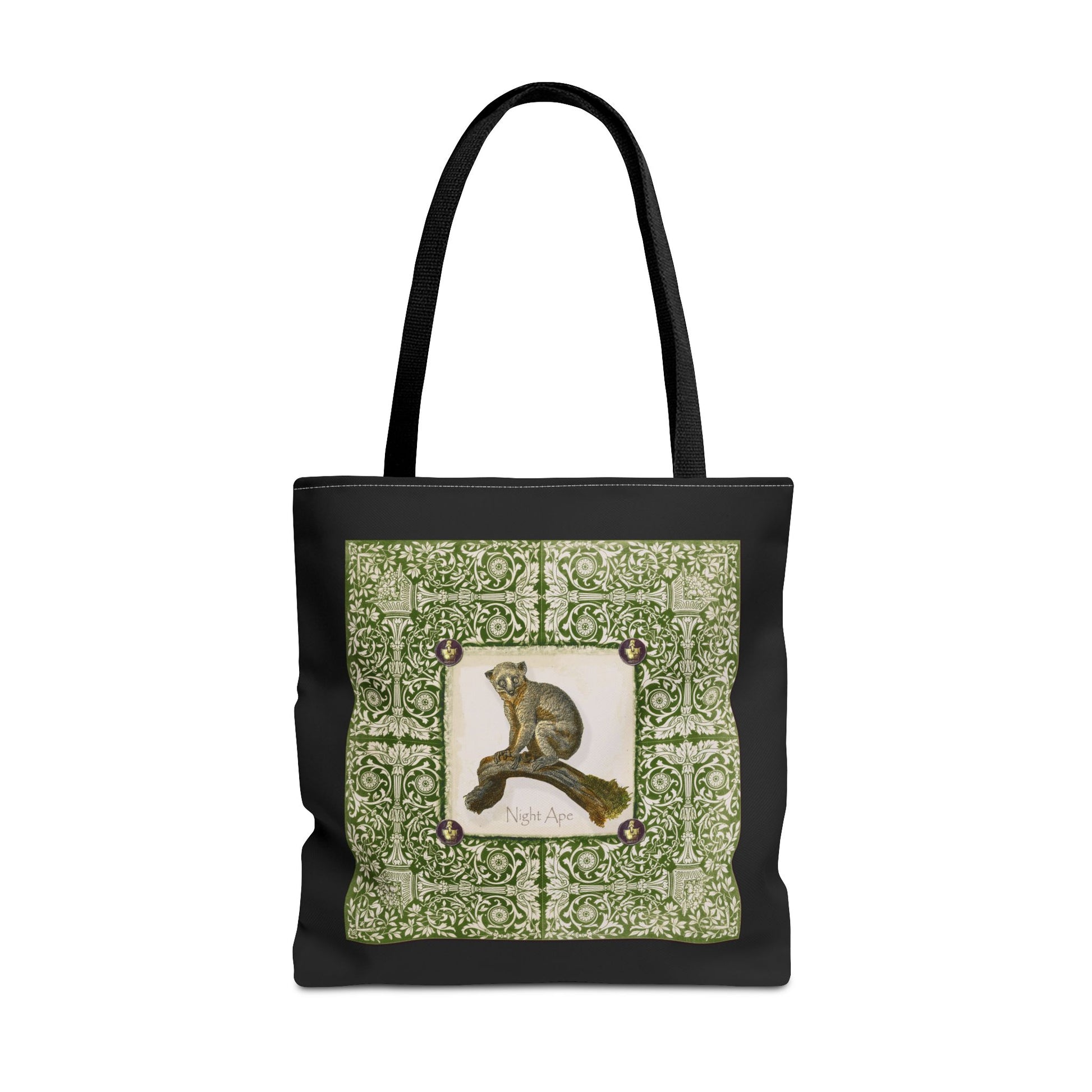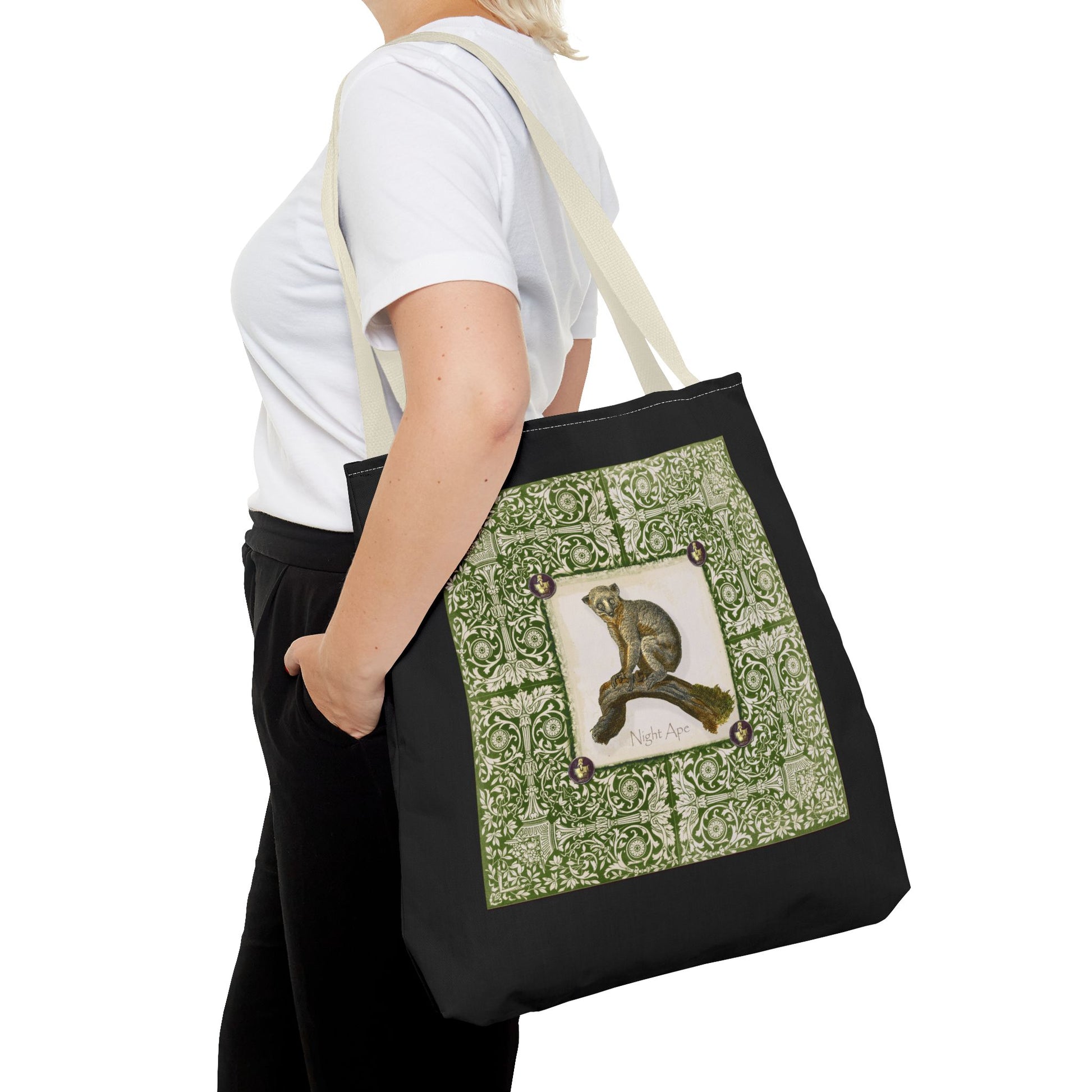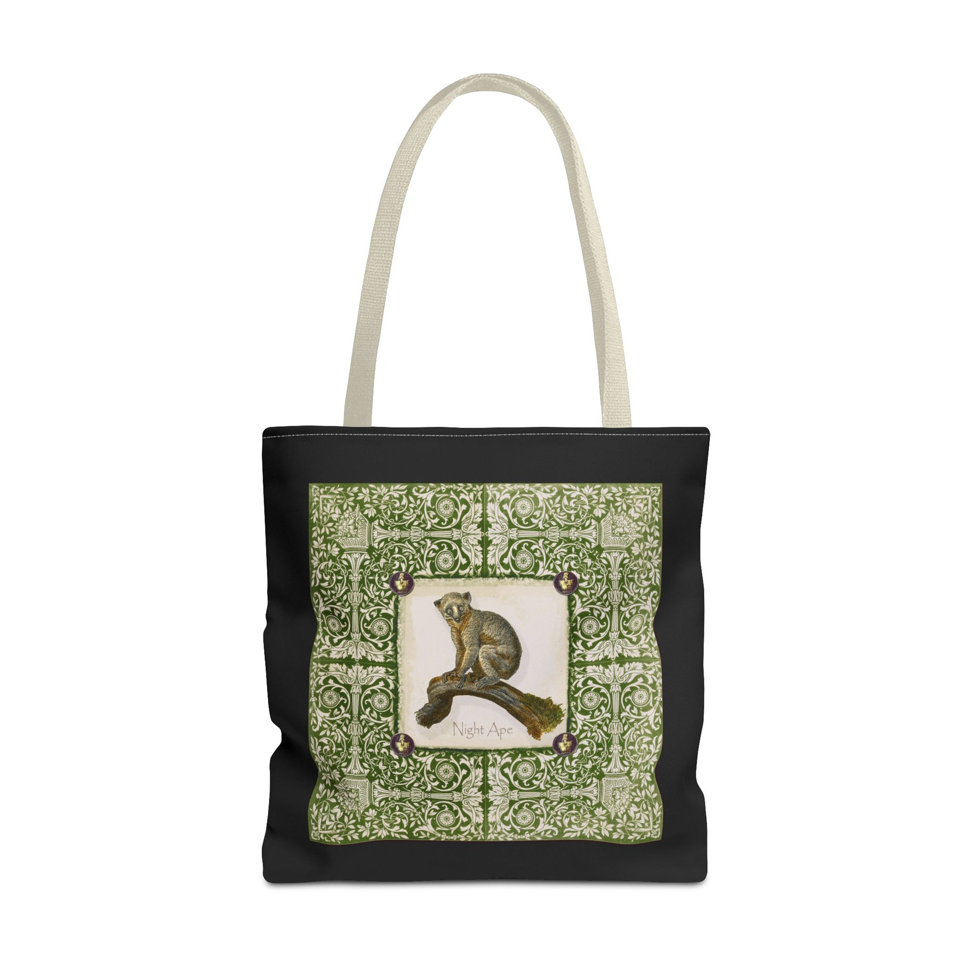 A favorite of the artist who had the adorable creatures around her as a young girl in Africa. The small Night Ape affectionately referred to as Pookie. Available in 3 sizes to add both functionality and style, these custom-printed tote bags come with two handle colors, Black or beige. Made with spun polyester, these bags feature double-stitched seams, cotton webbing straps, and nonwoven laminate lining for high-end durability.