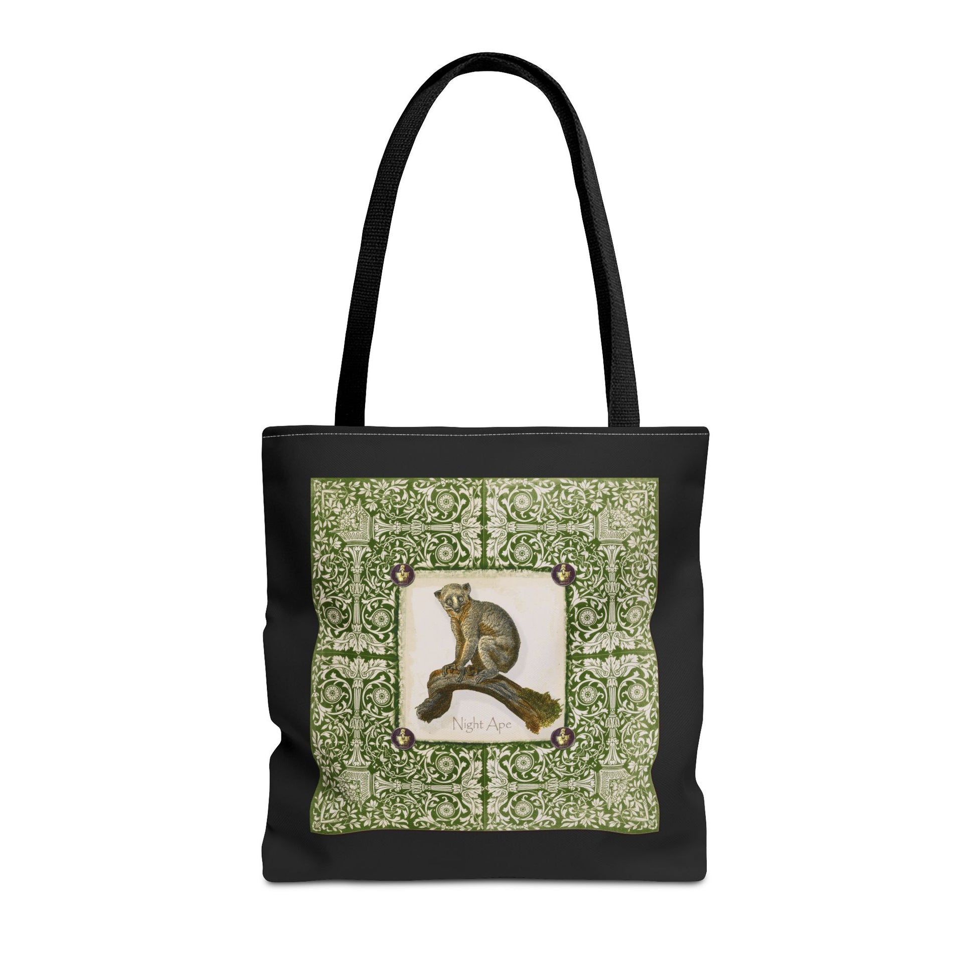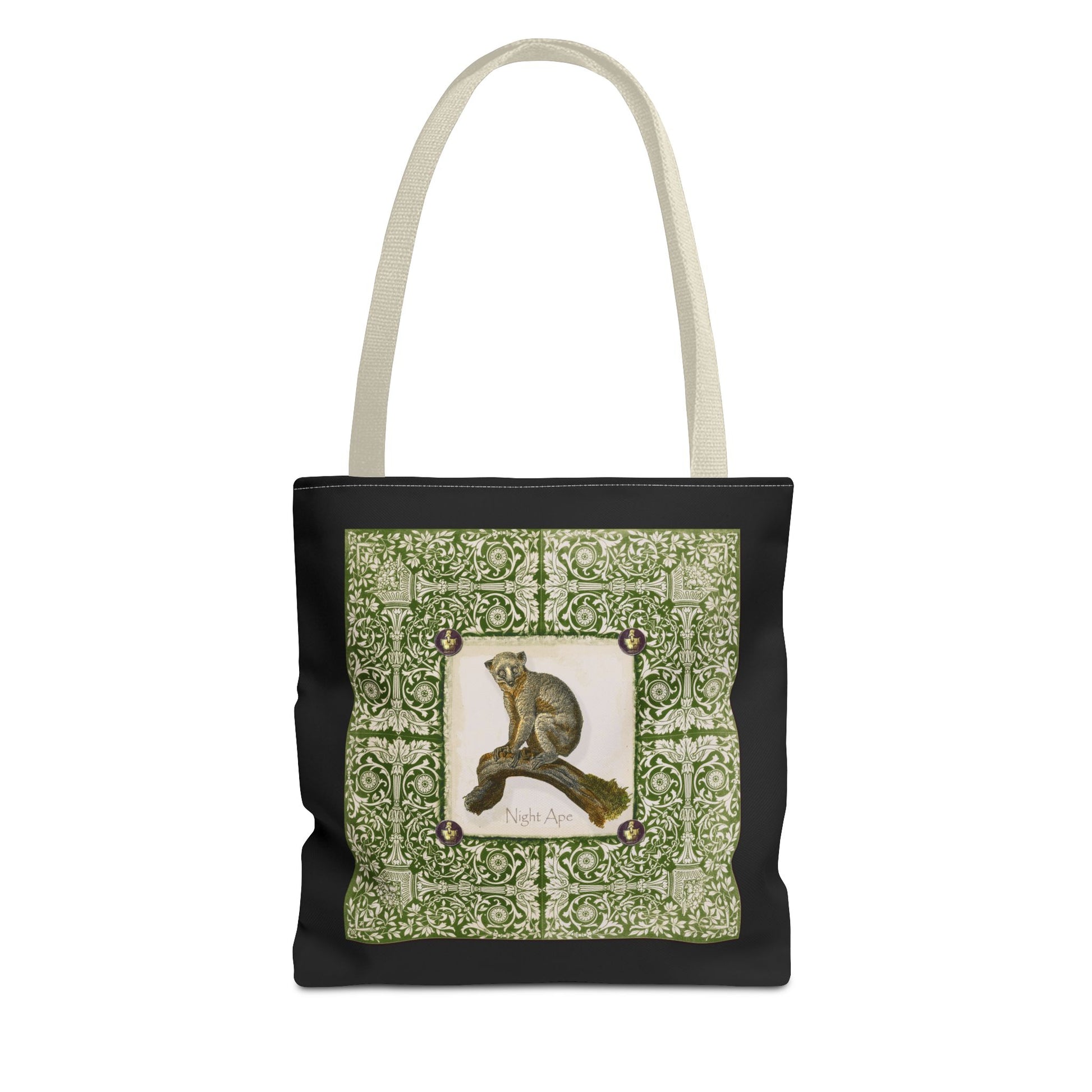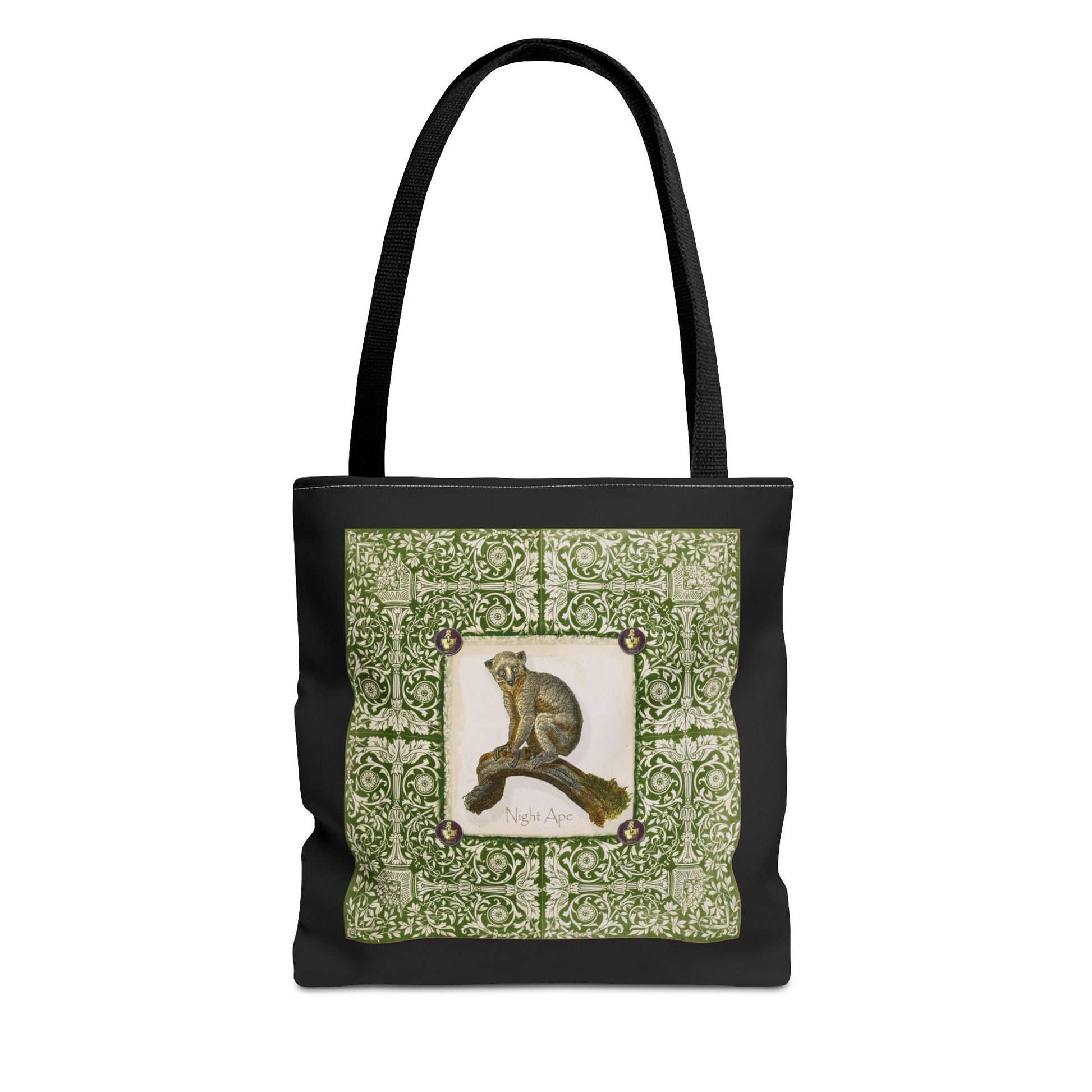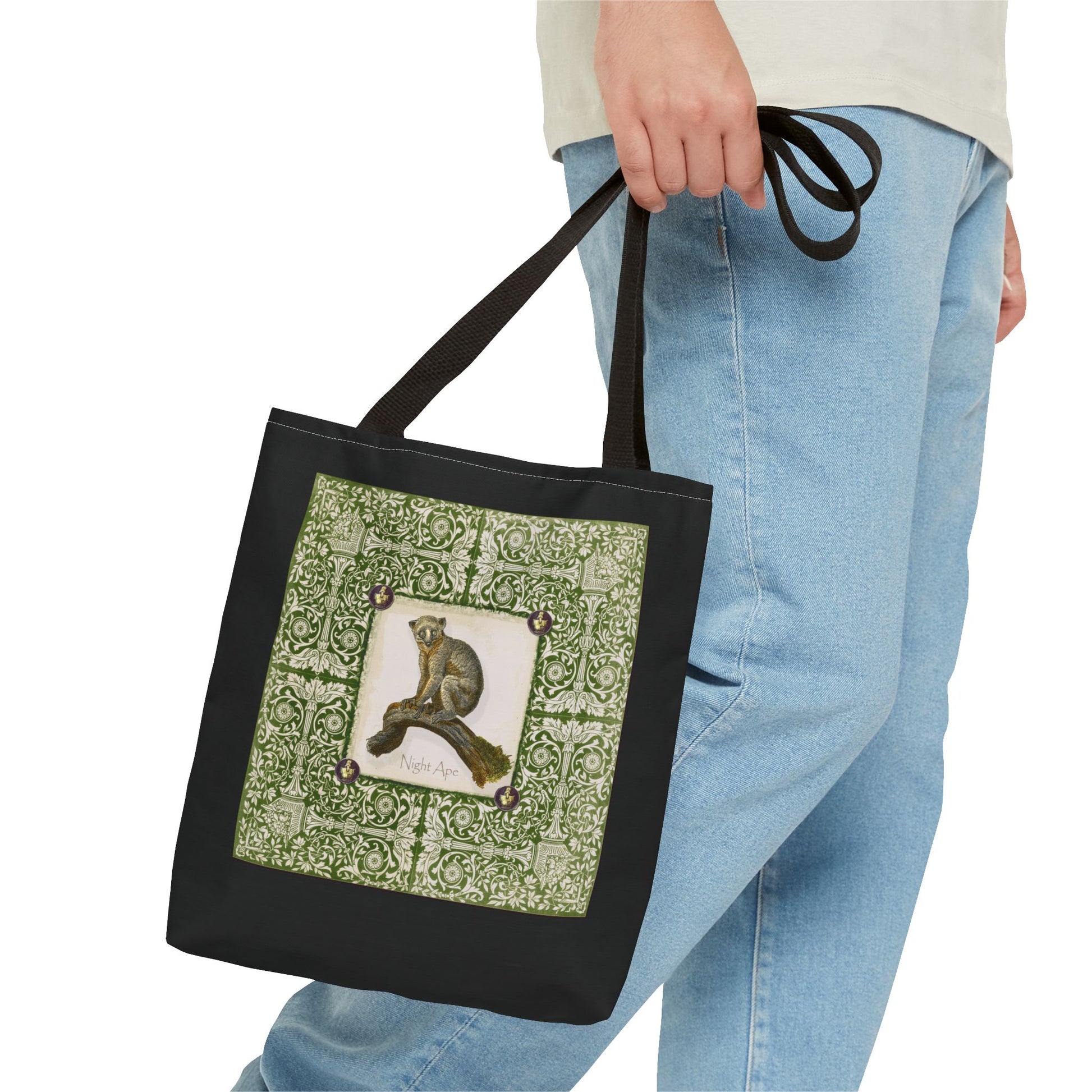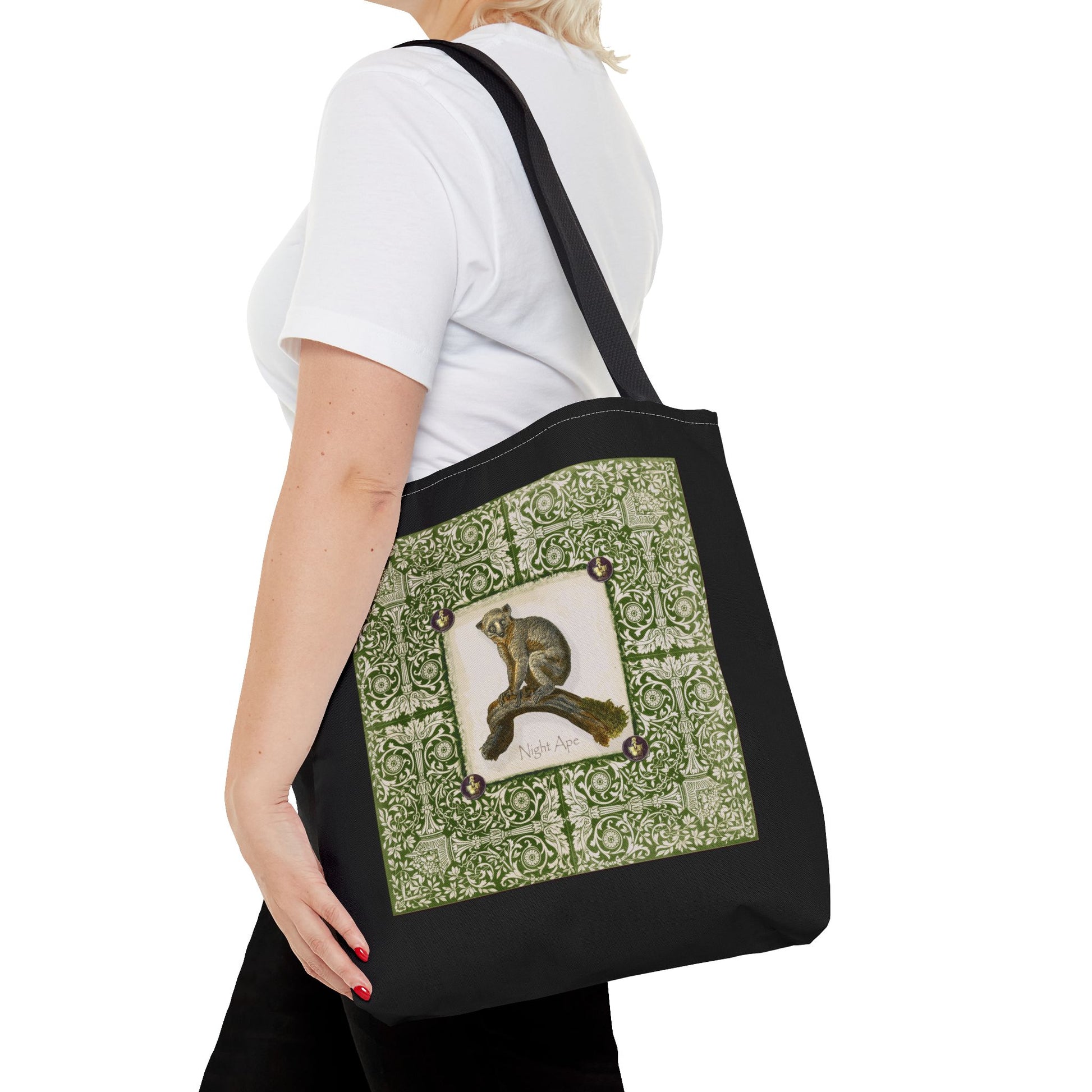 A favorite of the artist who had the adorable creatures around her as a young girl in Africa. The small Night Ape affectionately referred to as Pookie. Available in 3 sizes to add both functionality and style, these custom-printed tote bags come with two handle colors, Black or beige. Made with spun polyester, these bags feature double-stitched seams, cotton webbing straps, and nonwoven laminate lining for high-end durability.