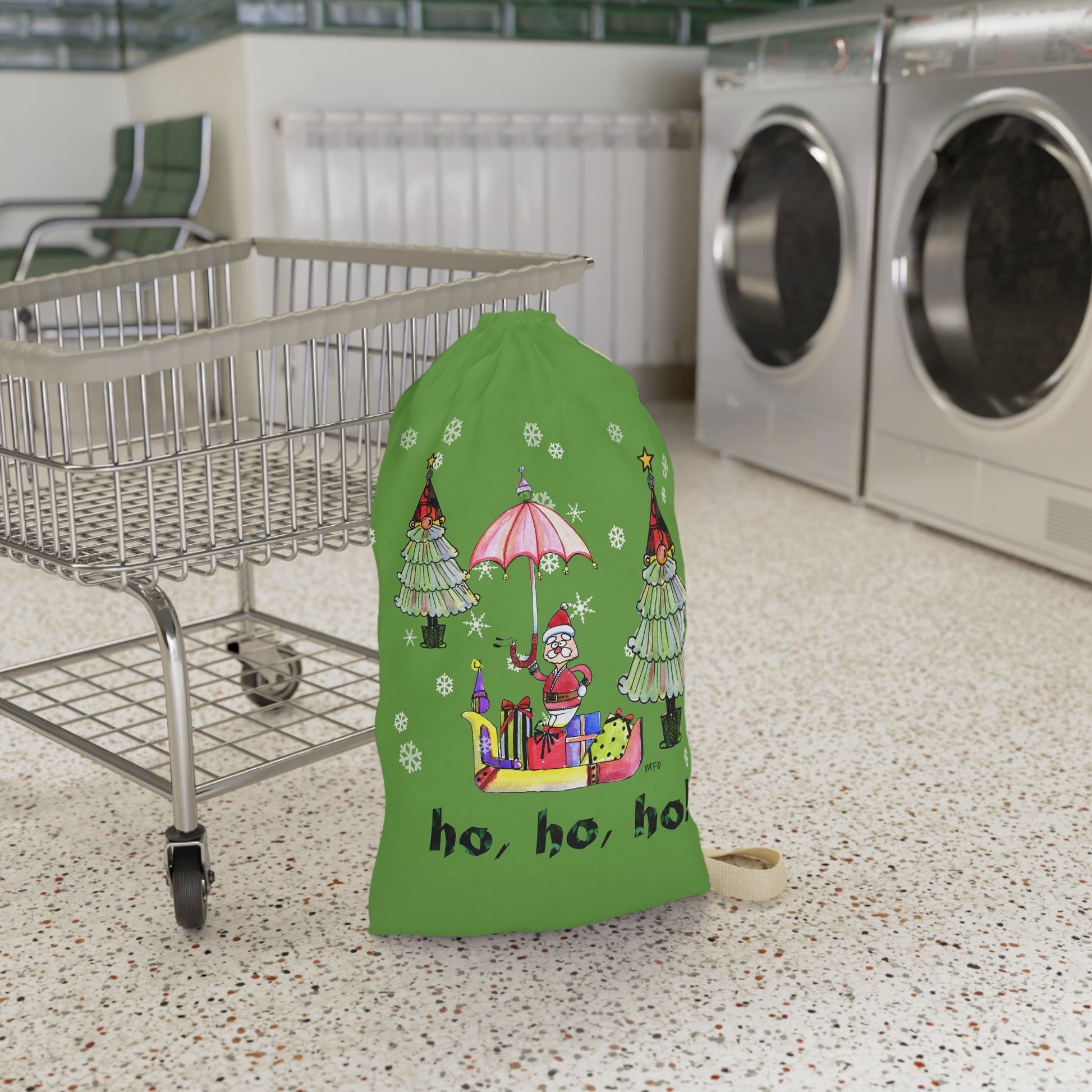 Christmas Laundry Bag — 'Ho, Ho, Ho!' Santa & Trees Holiday Wash Organizer by artist Marie Frederique