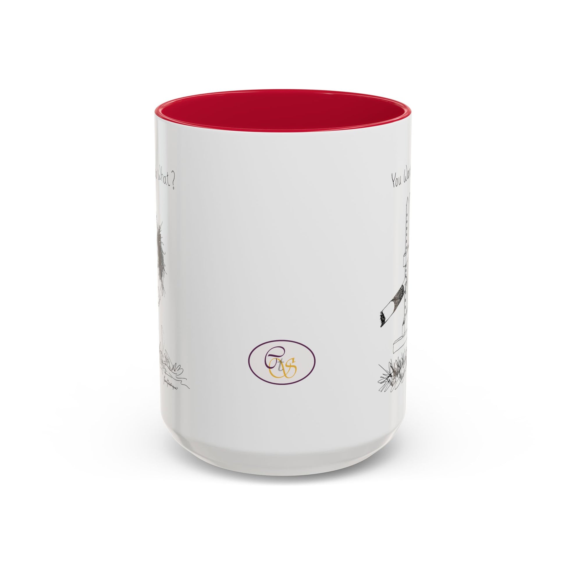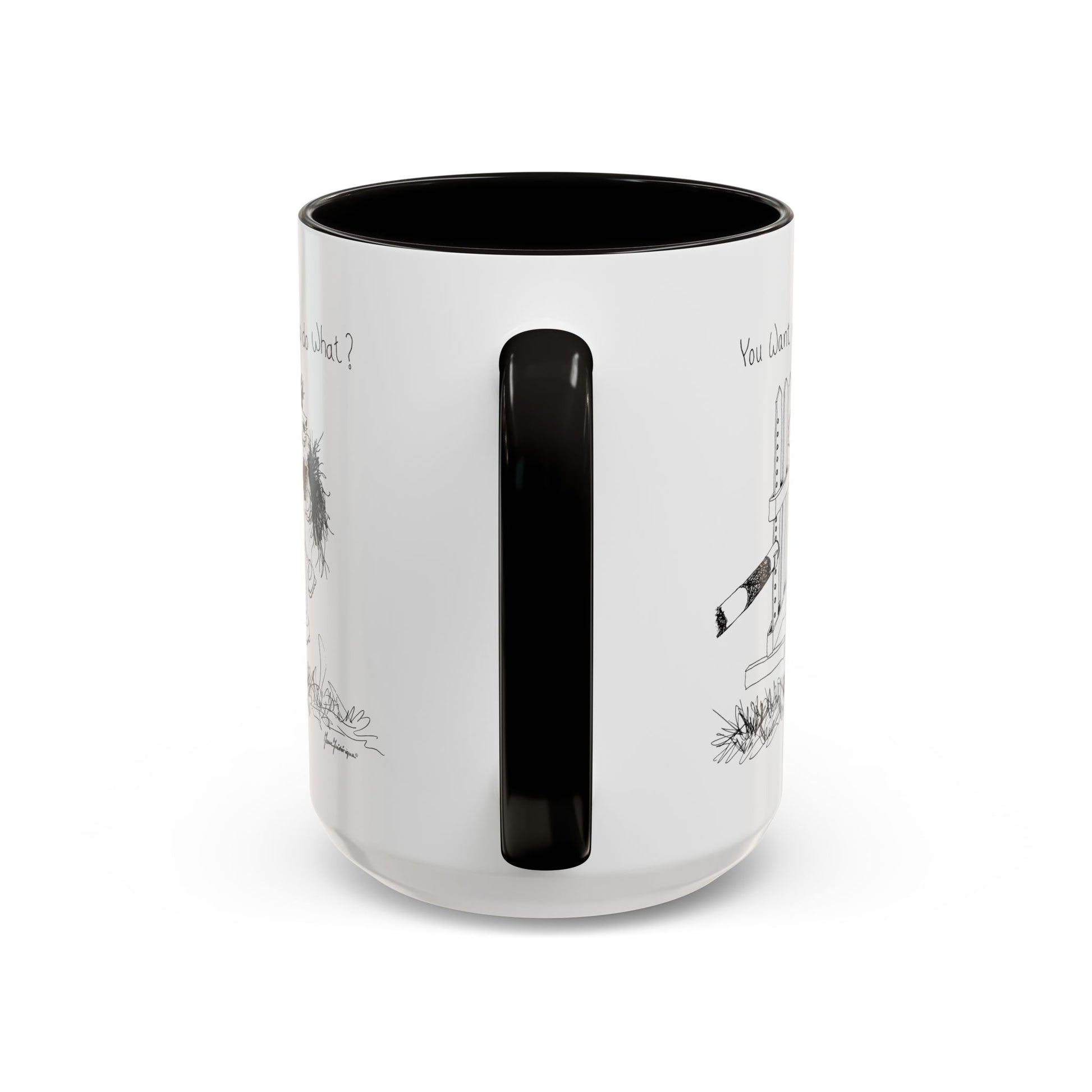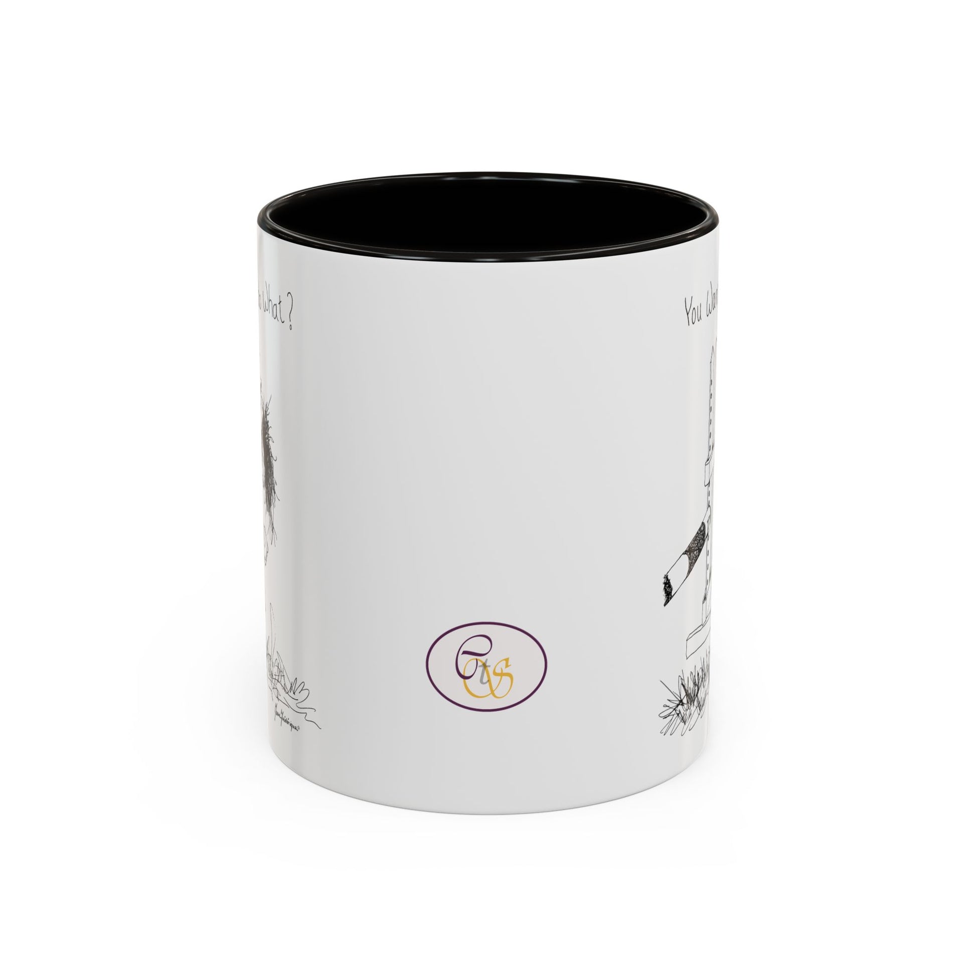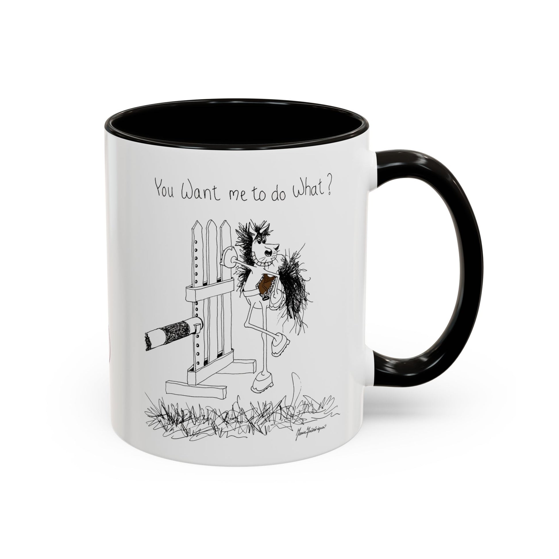 "You want me to do what?" the horse asks. "Get ready to be challenged!" Fly over hurdles with our CTS mug, available in 2 bold colors. Created by acclaimed artist Marie Frederique, this mug features a horse's point of view questioning its trainer and exasperating all concerned. Conquer your day with a cup of whimsical courage!