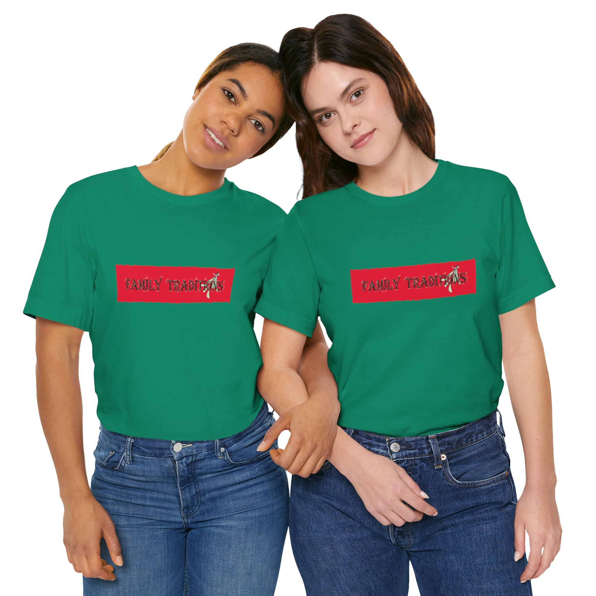 Family Traditions Mistletoe T‑Shirt — Christmas Red Banner Graphic Tee by artist Marie Frederique
