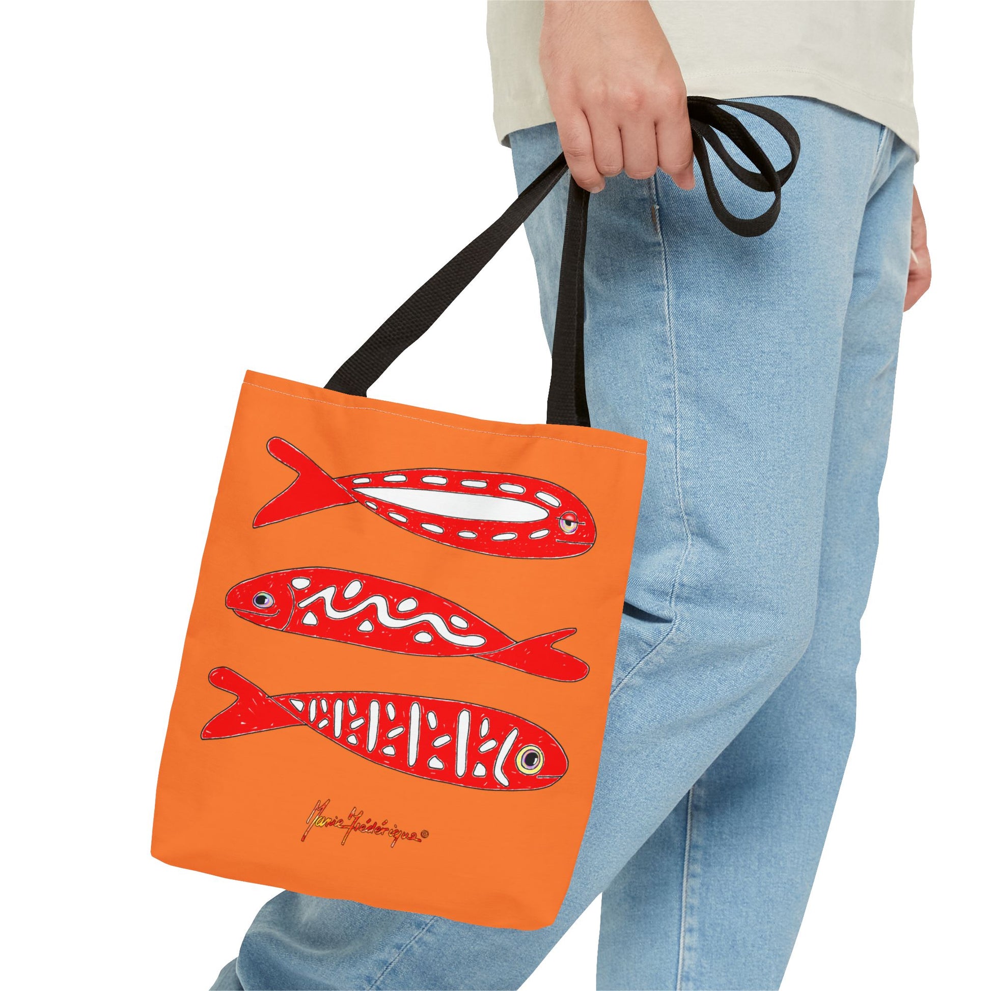 Fishing and camping lovers, introducing a vibrant tote that adds a splash of color to your everyday outings. Featuring a striking fish design on a bright orange backdrop, perfect for those who love unique and artistic pieces. Whether you're heading to the beach, your boat, the farmers market, camping or running errands, this tote is fashionable and also practical. Great for back to school or campus.