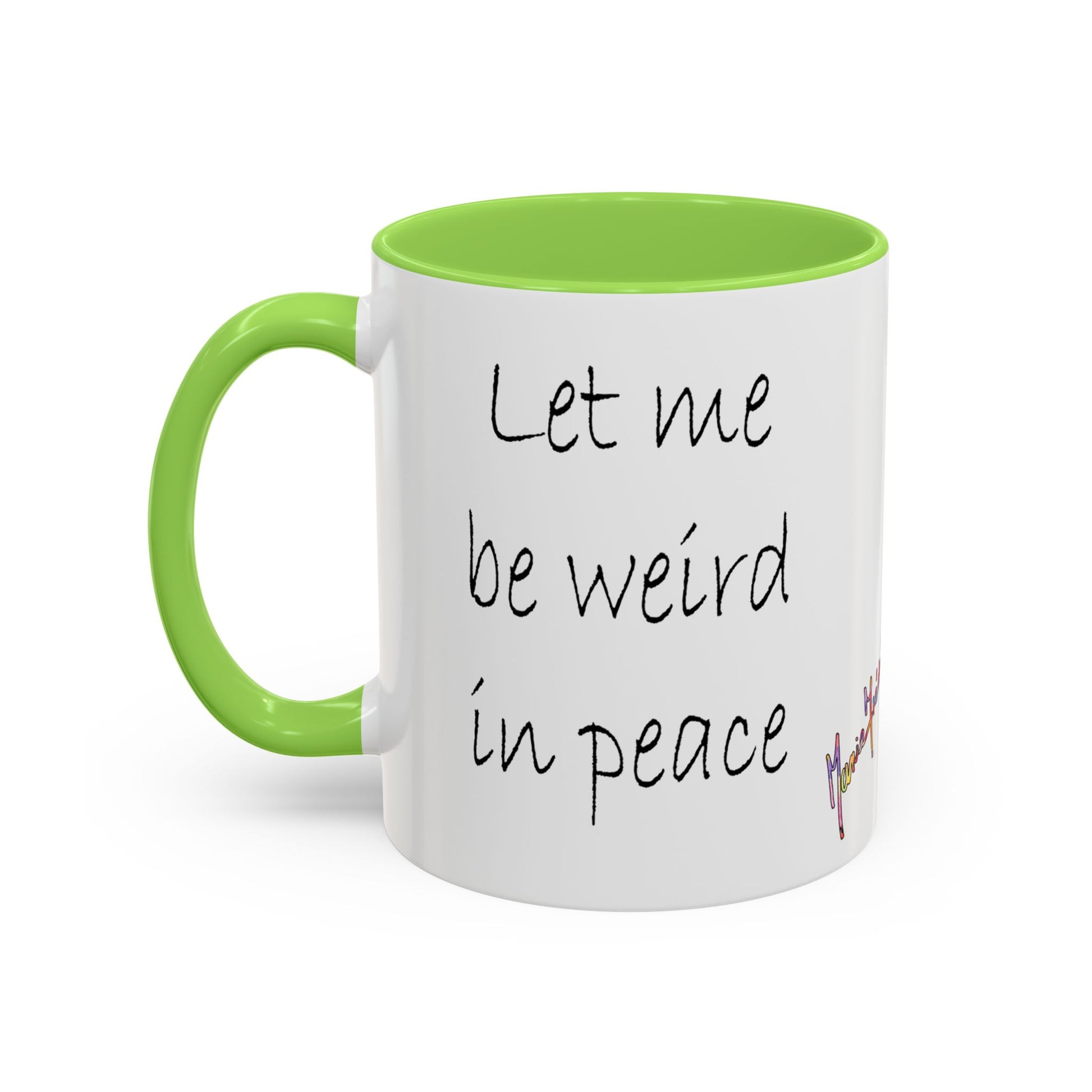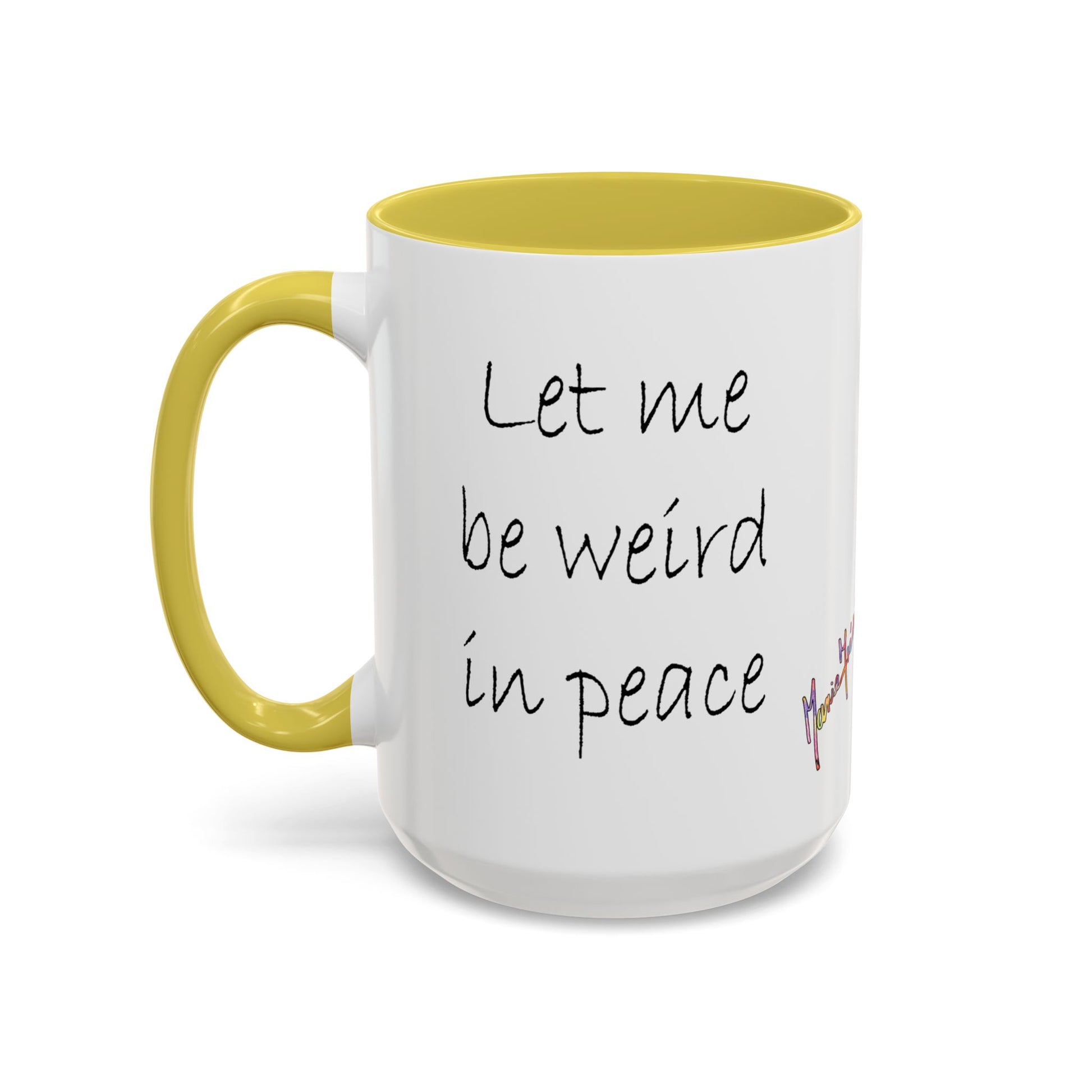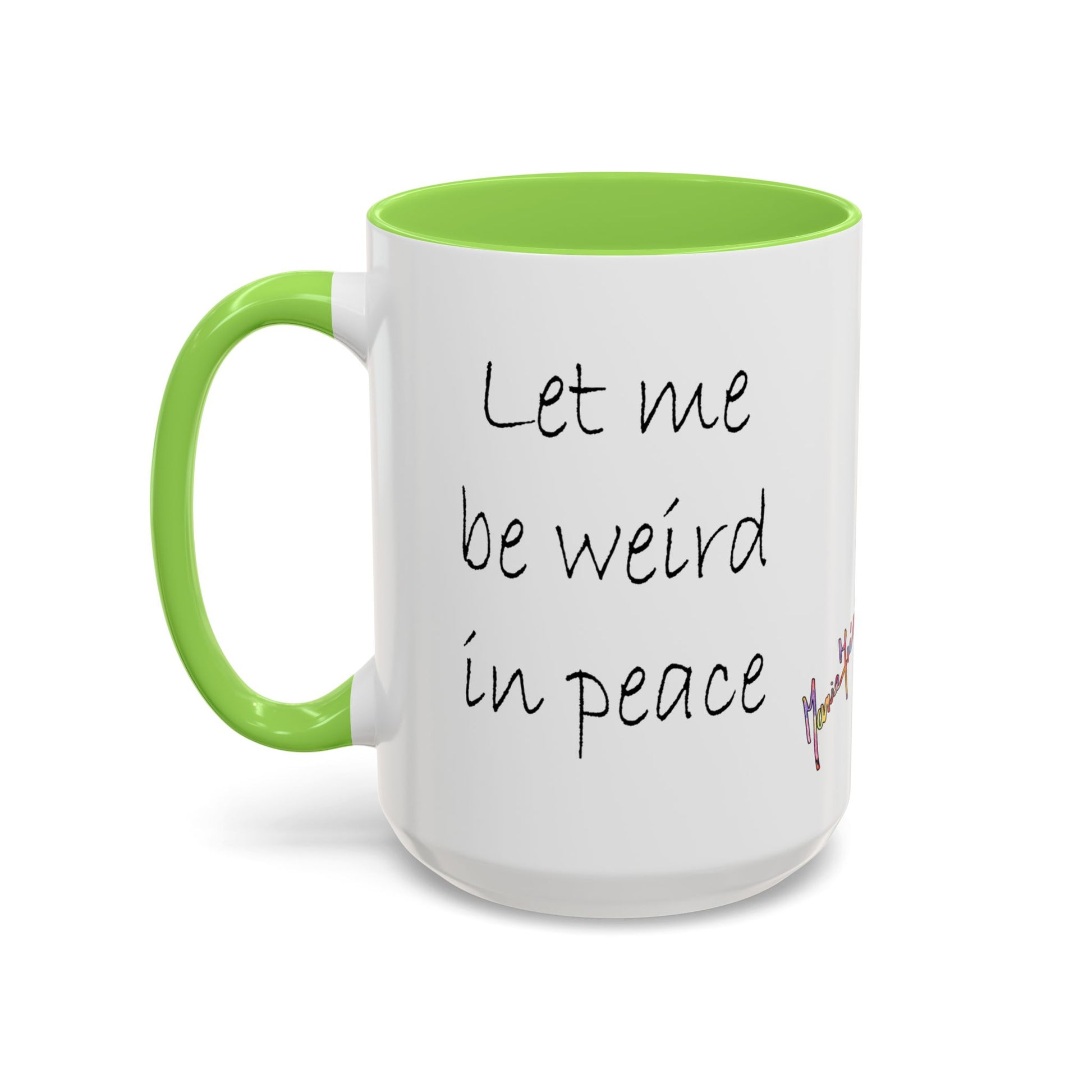 "Take a break from the daily grind with this bold and colorful mug featuring a motivational message from artist Marie Frederique. This mug is perfect for a risk-taker like you. Stay in you peaceful place and let others know to let you be weird in peace, live life to the fullest!"