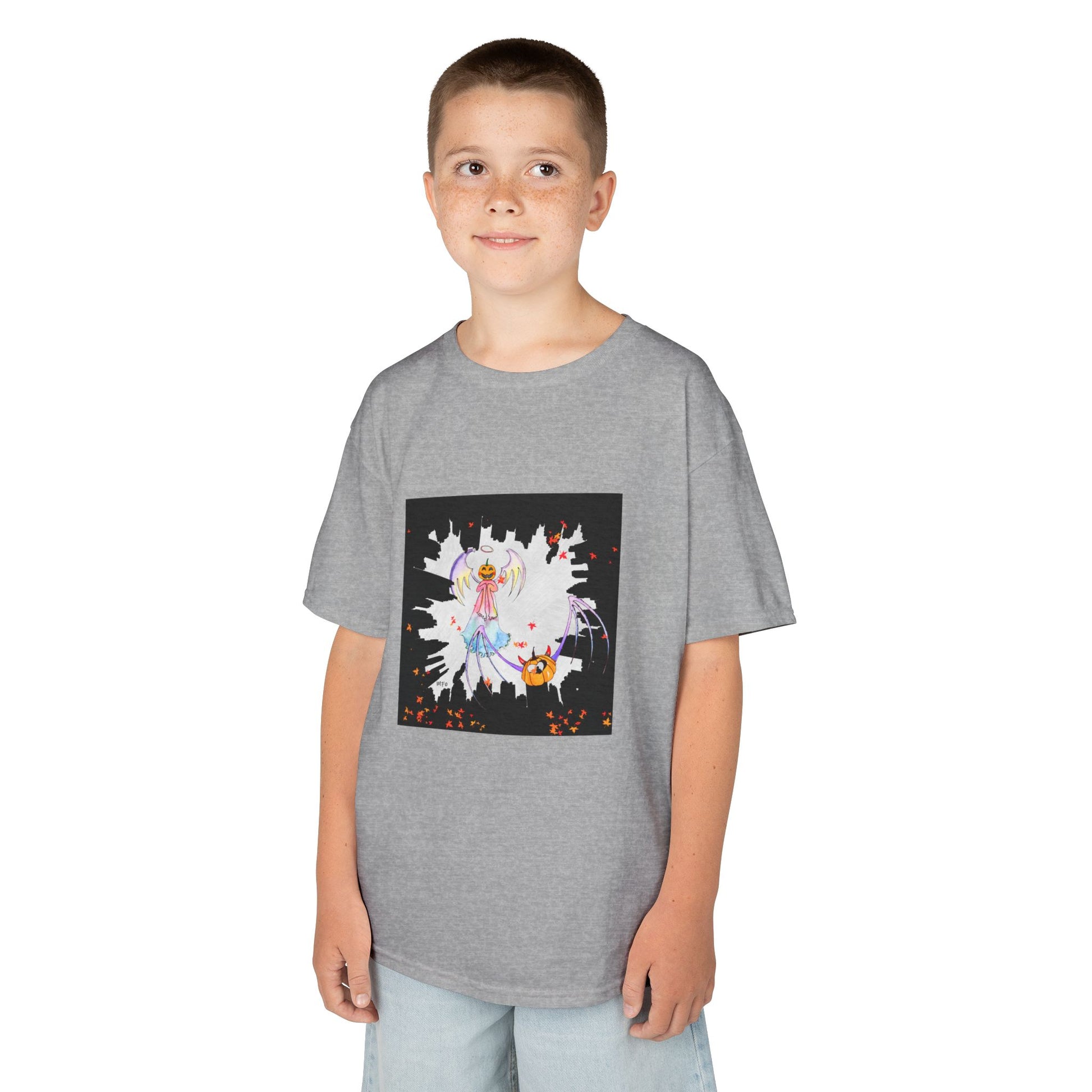 Halloween Angel and Pumpkin Heart Bat - Kids Heavy Cotton™ Tee by artist Marie Frederique