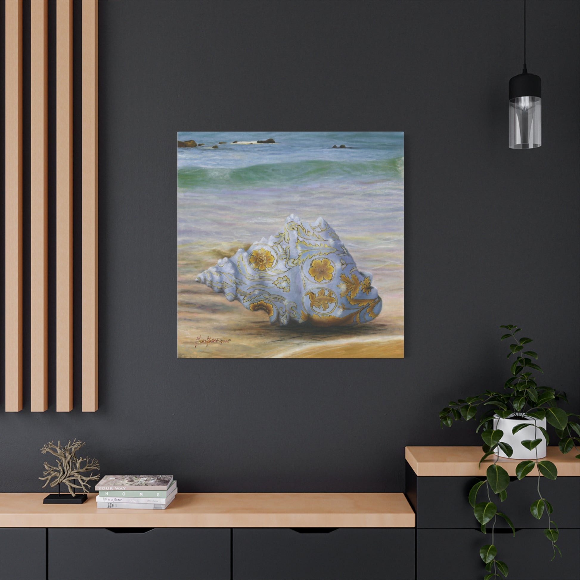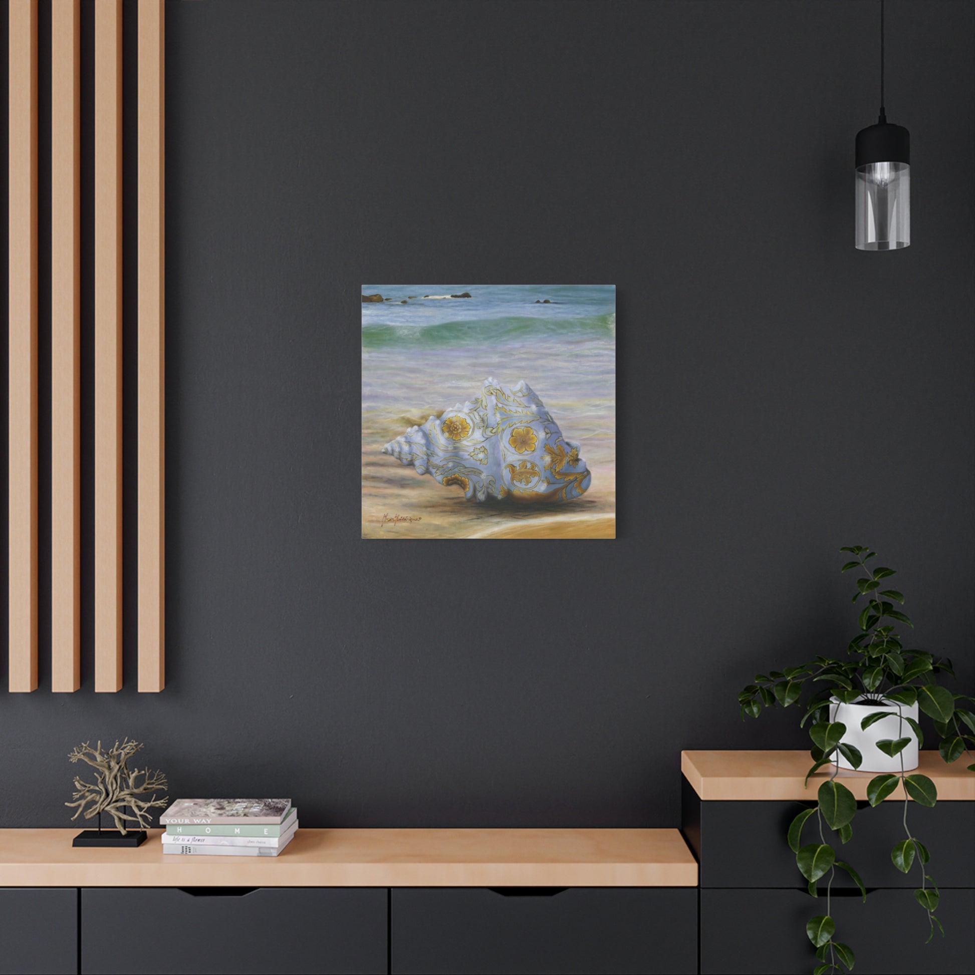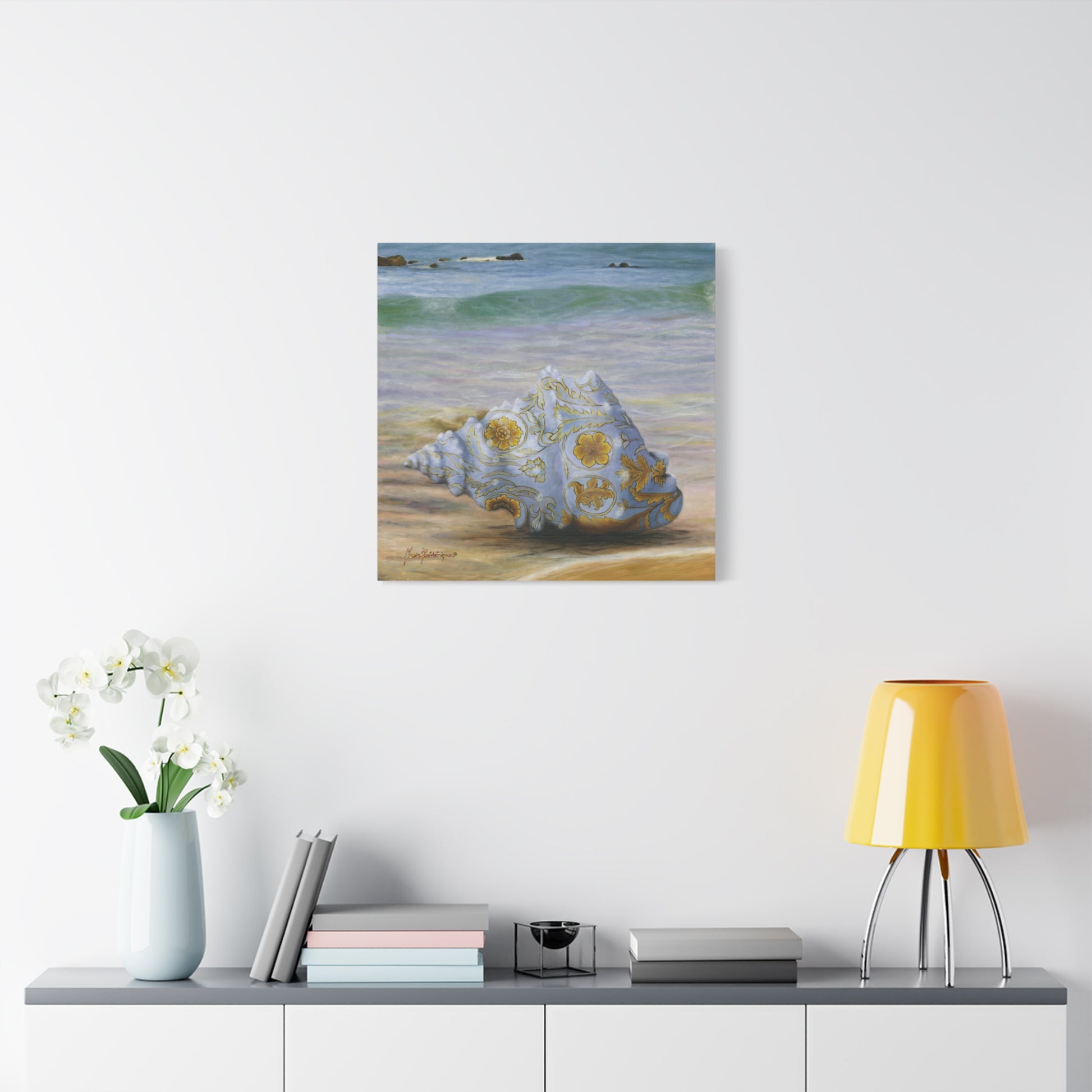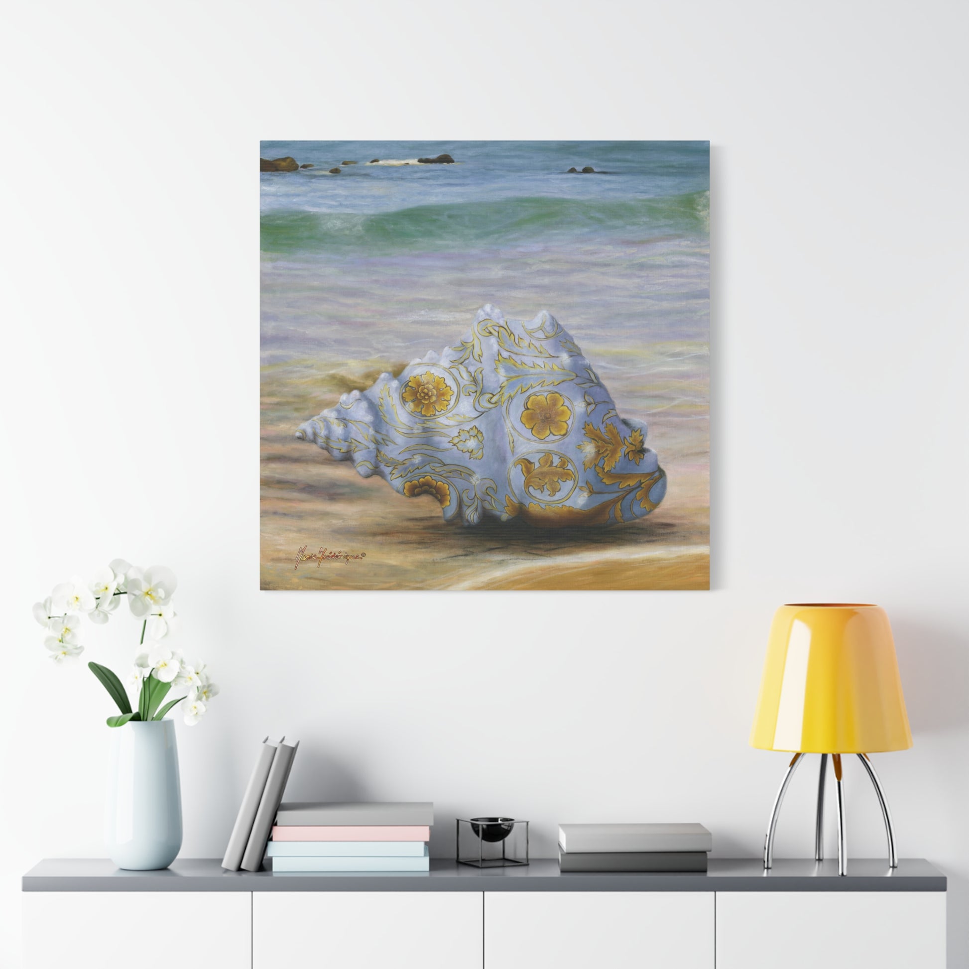 A beautifully painted shell like a tapestry sits on the shore, waves in tha background. You can smell the ocean breeze and hear its music. Transform your living space with this exquisite Stretched Canvas. Perfect for beach lovers and art enthusiasts, this canvas brings a serene coastal vibe that evokes the tranquility of ocean waves and sandy shores. Its stunning imagery becomes a focal point in any room, making it ideal for home decor, offices, or vacation getaways. Perfect for gifting on occasions such as housewarmings, birthdays, or holidays, this versatile piece will resonate with anyone who appreciates natural beauty and artistic expression. Add a touch of elegance to your walls and create an atmosphere of relaxation and inspiration.